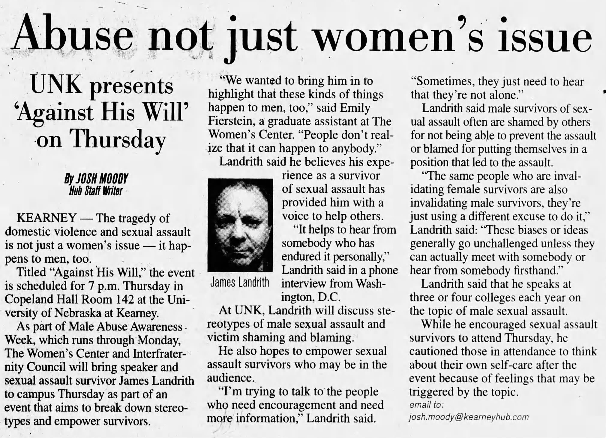 As part of Male Abuse Awareness Week, which runs through Monday, The Women’s Center and Interfraternity Council at the University of Nebraska at Kearney will bring speaker and sexual assault survivor James Landrith to campus Thursday as part of an event that aims to break down stereotypes and empower survivors.