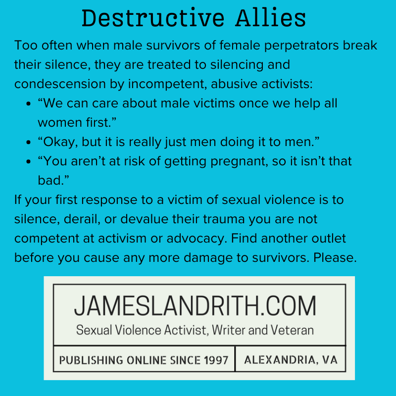 Too often when male survivors of female perpetrators break their silence, they are treated to silencing and condescension by incompetent, abusive activists: