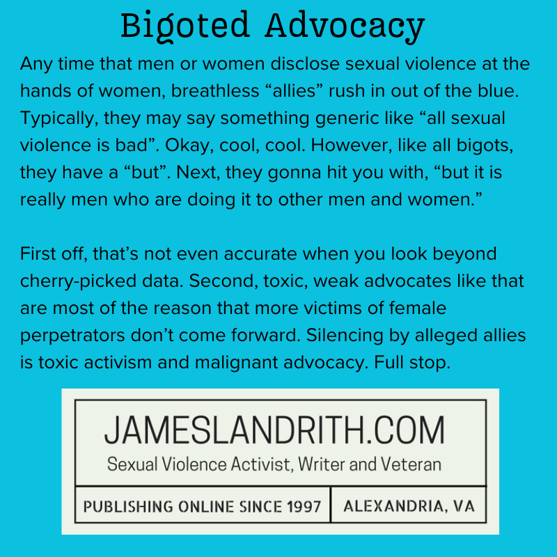 First off, that’s not even accurate when you look beyond cherry-picked data. Second, toxic, weak advocates like that are most of the reason that more victims of female perpetrators don’t come forward. Silencing by alleged allies is toxic activism and malignant advocacy. Full stop.